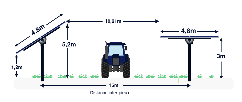 Le choix de la technologie employée sur ce site s’est porté sur des trackers solaires, correspondant à des ombrières hautes pilotables permettant le pâturage et la fauche avec un minimum de contraintes. Les modalités sont présentées dans le plan de coupe ci-dessous.