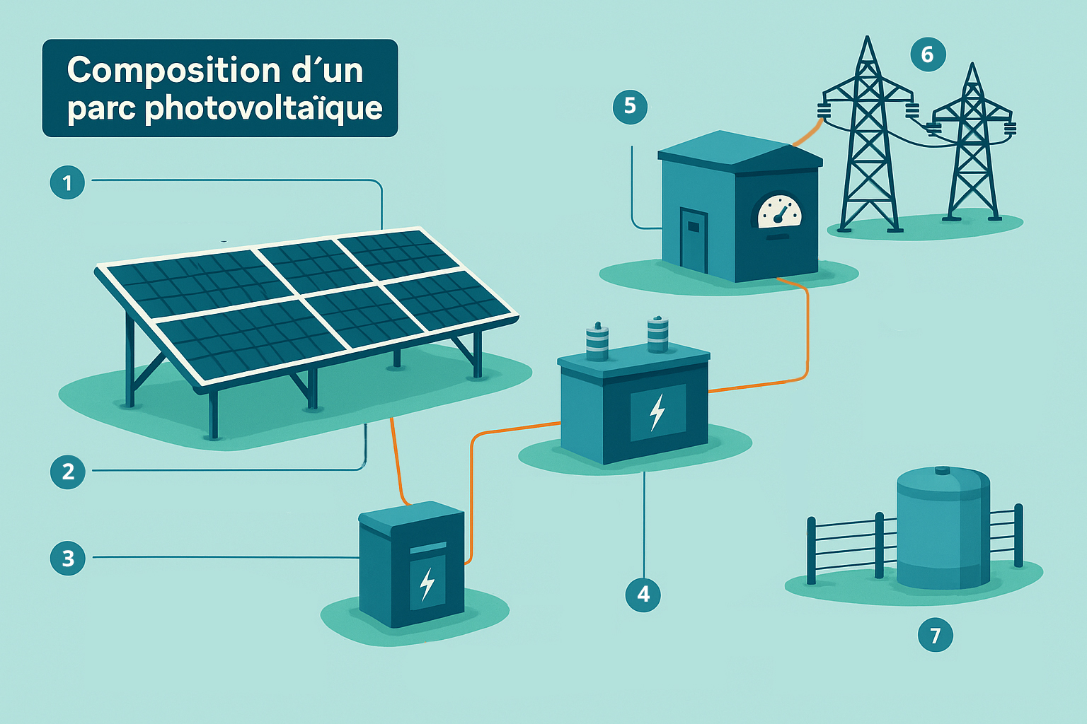 6) Des lignes de raccordement transfèrent l’énergie produite du parc au réseau public de distribution